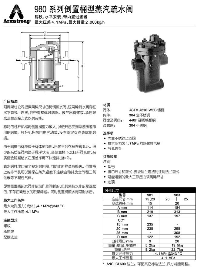 阿姆斯壯公司提供兩種尺寸的鑄鋼疏水閥,這兩種疏水閥均在水平管線上連接,并帶有整體過濾器。該產(chǎn)品有螺紋、承插焊或法蘭連接方式以供選擇。