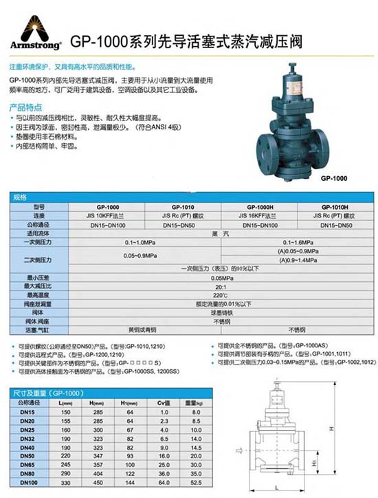 阿姆斯壯GP-1000系列減壓閥用于精確調(diào)節(jié)多種范圍的流體壓力。由于采用了內(nèi)導(dǎo)式設(shè)計,因此無須外部零件和接管。