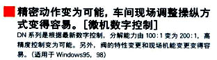 一般用于2方閥控制。根據微機控制將流量特性為直線的定為2L,近似于圓弧的稱為2E,綜合這兩種類型的稱為比例控制。請根據控制系統的特性選擇2L和2E。一般2L大多用于溫度控制和液面控制,2E大多用于壓力控制、流量控制。這些特性在安裝后也可以改變,而且特性可以任意設定。 |