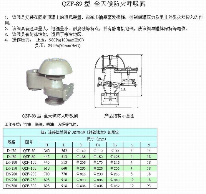 QZF-89型全天候阻火呼吸閥是安裝在固定頂罐上的通風裝置,起減少油品蒸發損耗,控制儲罐壓力及阻止外界火焰傳入的作用。 該閥具有通風量大,泄漏量小,耐腐蝕等特點,并有靜電接地線,使該閥與罐體保持等電位。該閥具有防凍性能,適用于寒冷地區。 QZF-89全天候阻火呼吸閥性能及特點: